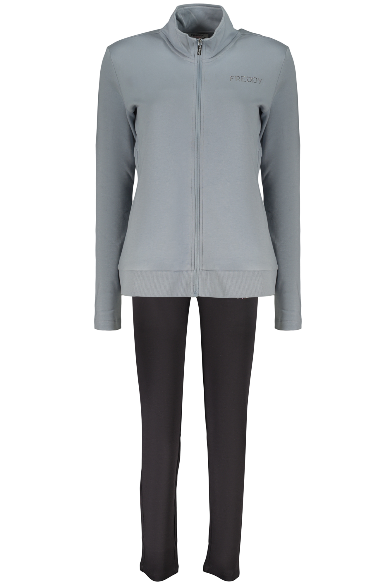 SET FELPA E PANTALONE, FELPA MANICHE LUNGHE AZZURRA, 2 TASCHE, ZIP, PANTALONE SPORTIVO NERO, ELASTICO IN VITA CON LACCI, APPLICAZIONE STRASS, LOGO