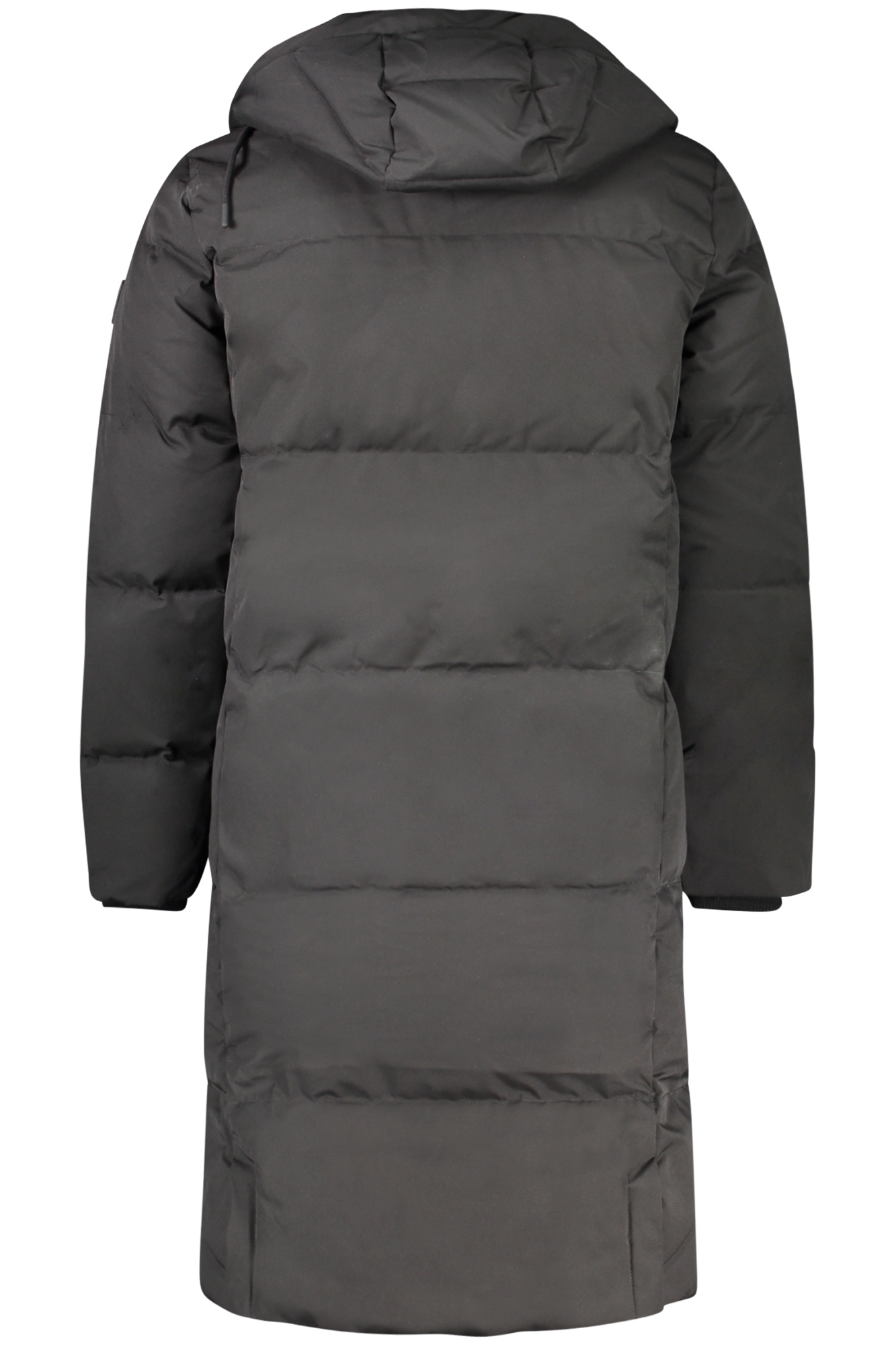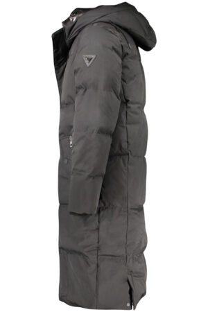 GIUBBOTTO LUNGO MANICHE LUNGHE CON CAPPUCCIO, DOPPIA TASCA ESTERNA, 1 TASCA INTERNA, DOPPIA CERNIERA, BOTTONI, RESISTENTE ALL’ACQUA, VERA PIUMA, LOGO, FIBRE RICICLATE