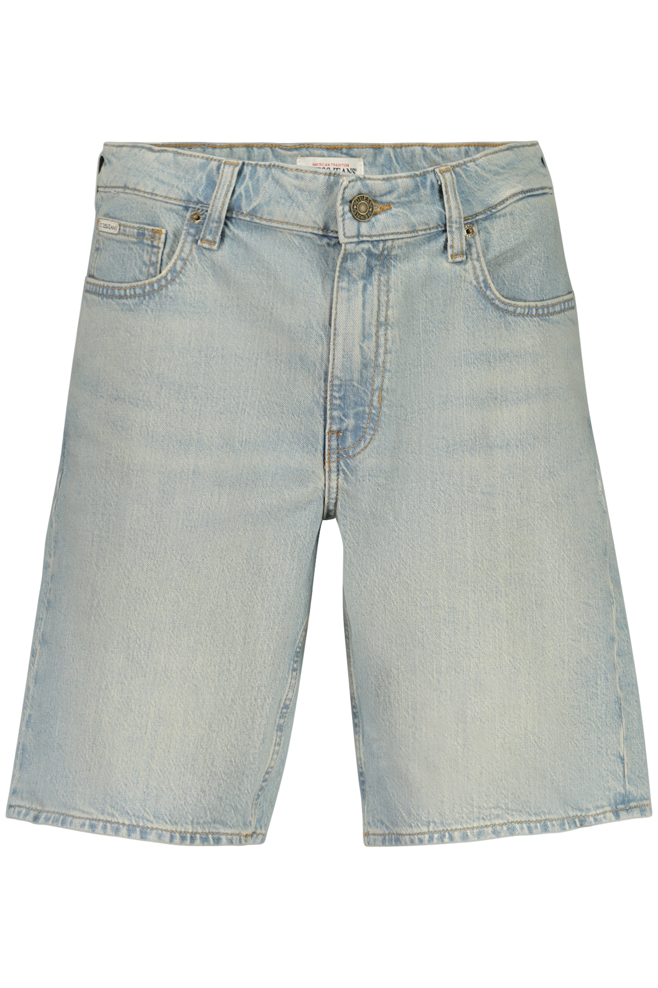 BERMUDA IN JEANS, CLASSIC, 5 TASCHE, EFFETTO SLAVATO, BOTTONE E ZIP, LOGO