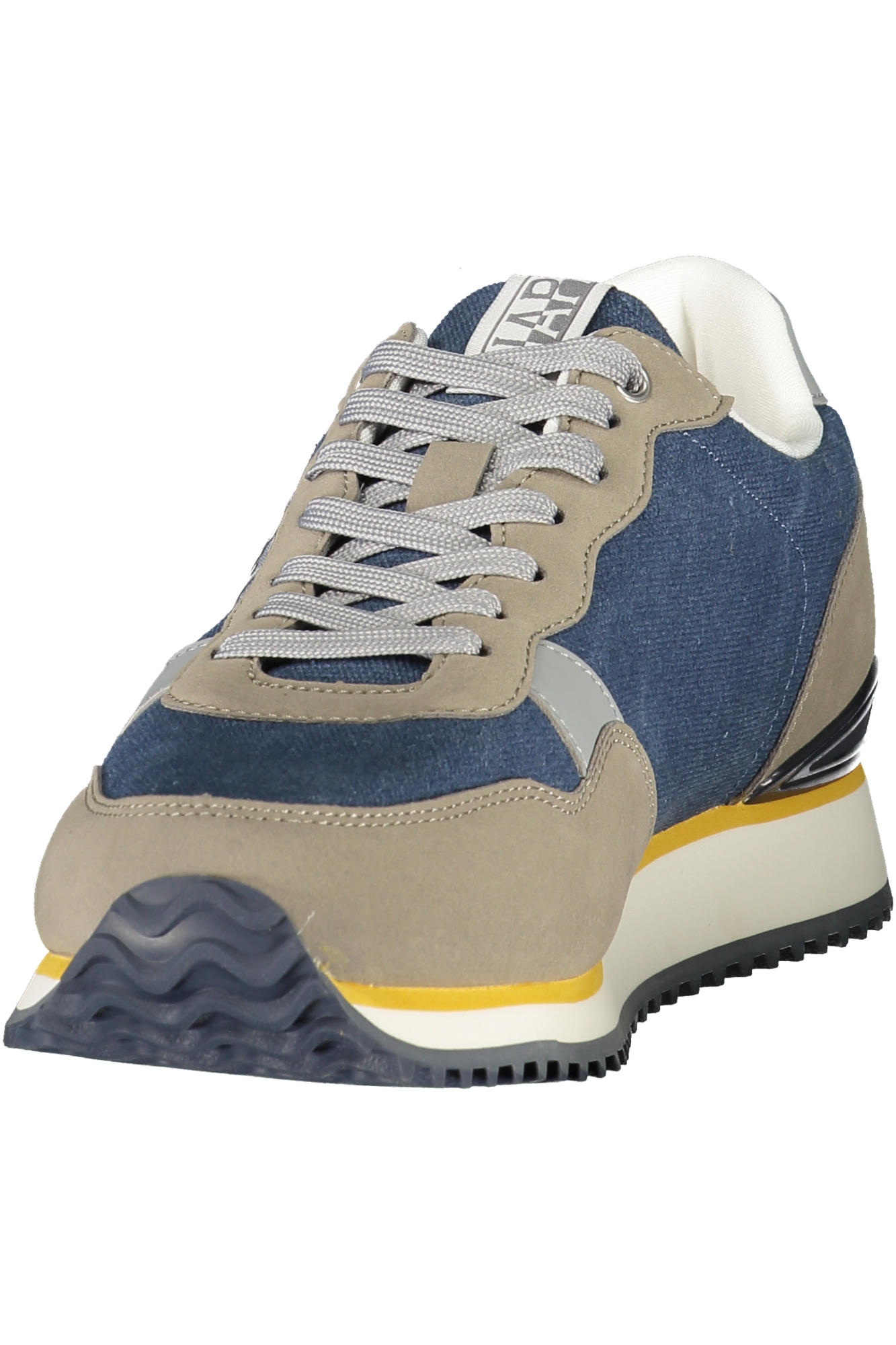 CALZATURA SPORTIVA CON LACCI, DOPPIO LACCIO A CONTRASTO, DETTAGLI A CONTRASTO IN BLU/GRIGIO/OCRA, PLANTARE REMOVIBILE, STAMPA, LOGO