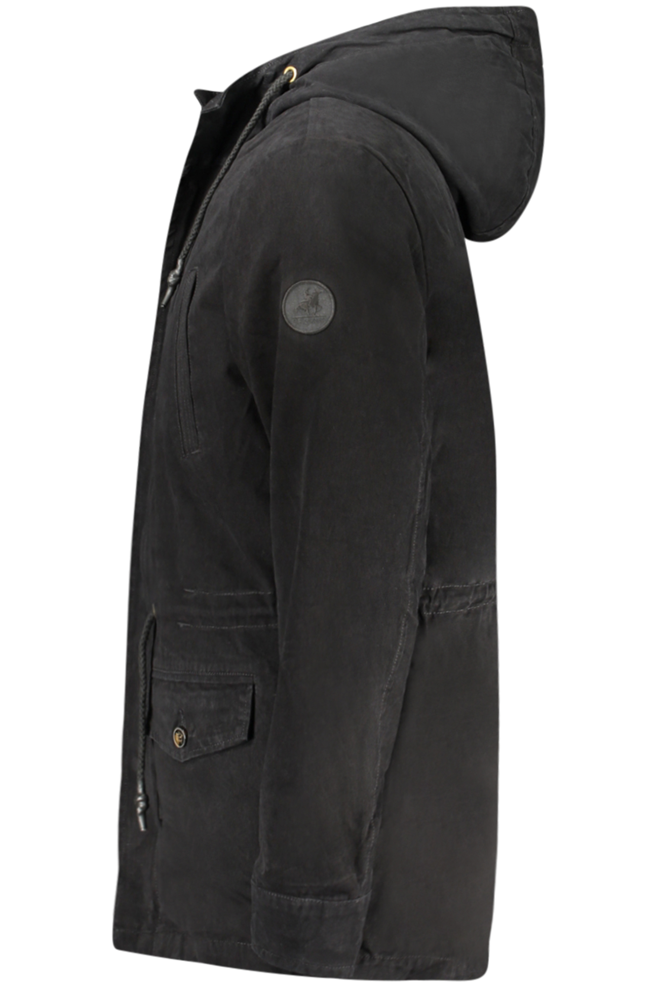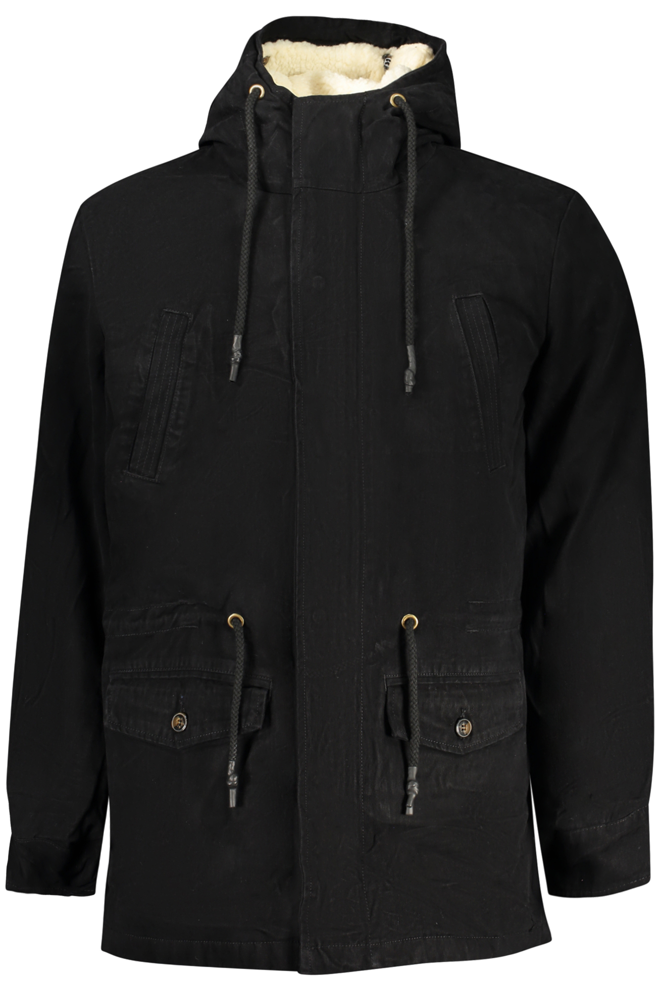 GIUBBOTTO MANICHE LUNGHE CON CAPPUCCIO, PARKA, 4 TASCONI ESTERNI, INTERNO CON PELO EFFETTO PECORA REMOVIBILE, ZIP, AUTOMATICI, BOTTONI E COULISSE IN VITA, LOGO
