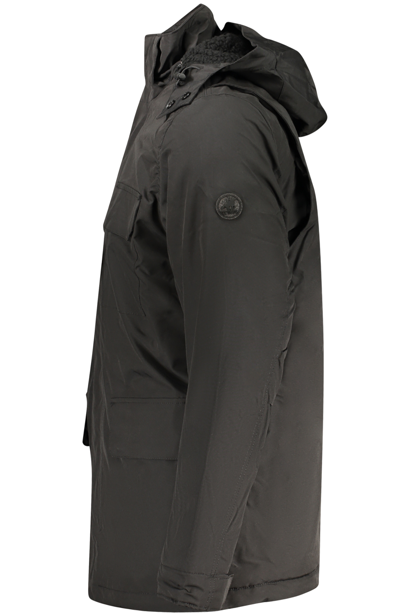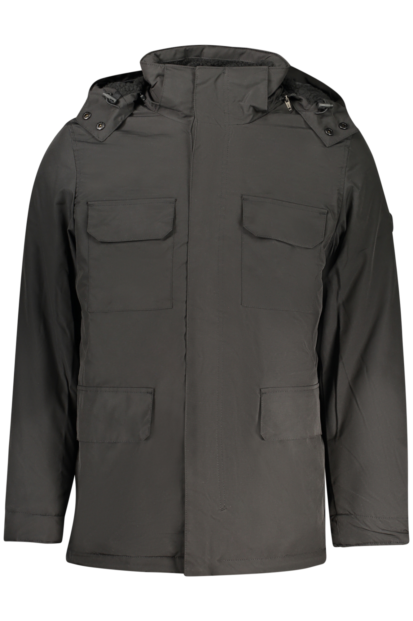 GIUBBOTTO LUNGO MANICHE LUNGHE CON CAPPUCCIO REMOVIBILE, PARKA, 4 TASCONI ESTERNI, 1 TASCA INTERNA, INTERNO CON PELO EFFETTO PECORA, ZIP, AUTOMATICI, APPLICAZIONE, LOGO