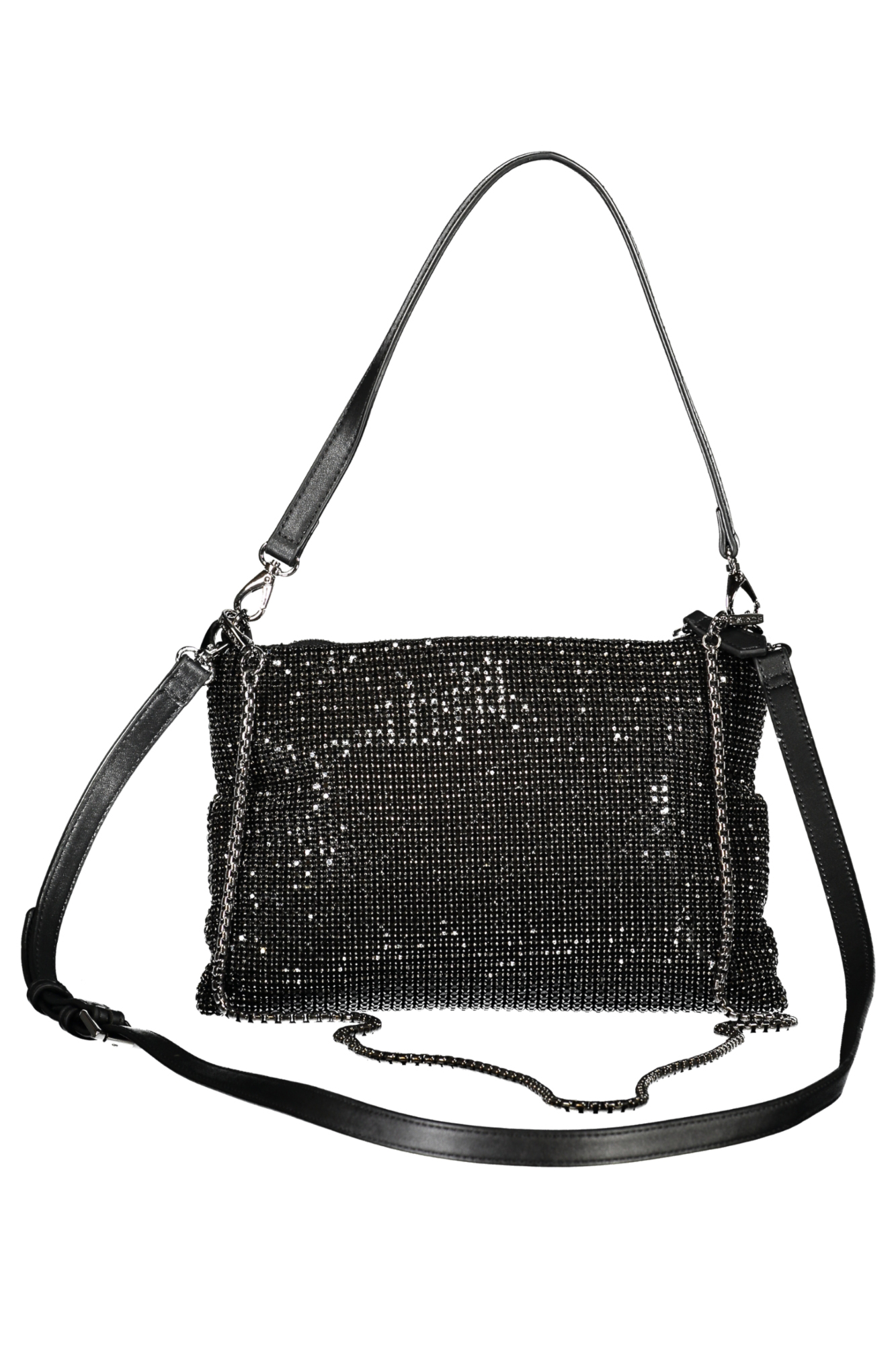 POCHETTE 1 MANICO A SPALLA REMOVIBILE, DOPPIA TRACOLLA 1 IN CATENA E 1 REGOLABILE E REMOVIBILI, 2 TASCHE INTERNE, DETTAGLI A CONTRASTO, STRASS, CHIUSURA CON ZIP, LOGO